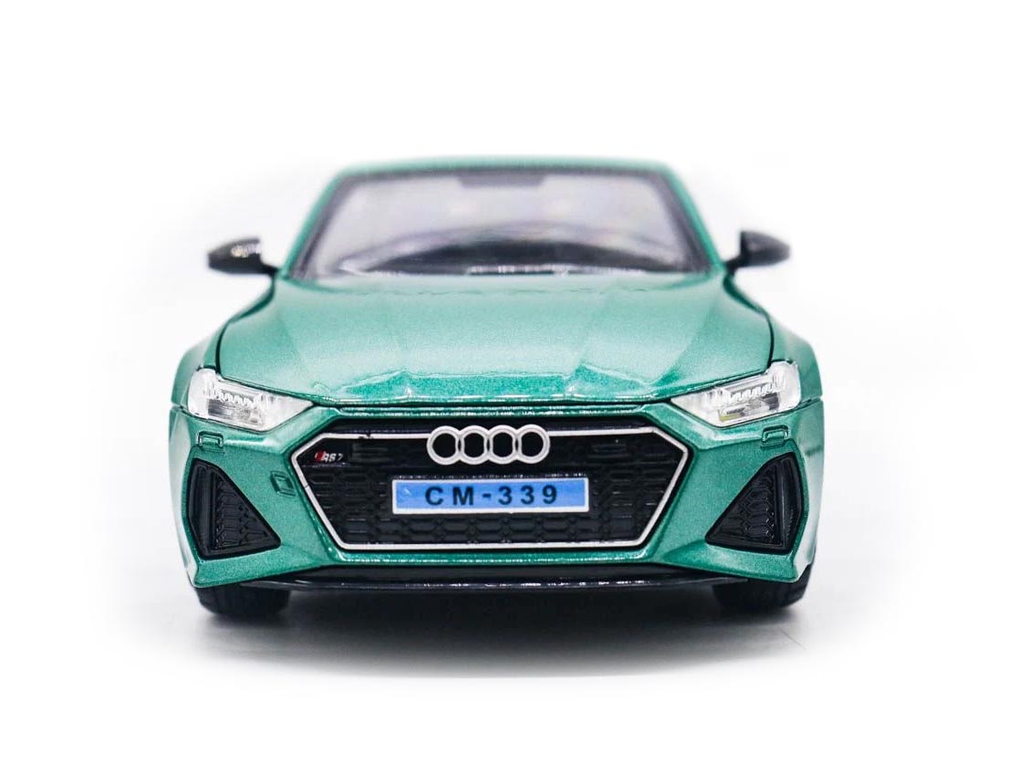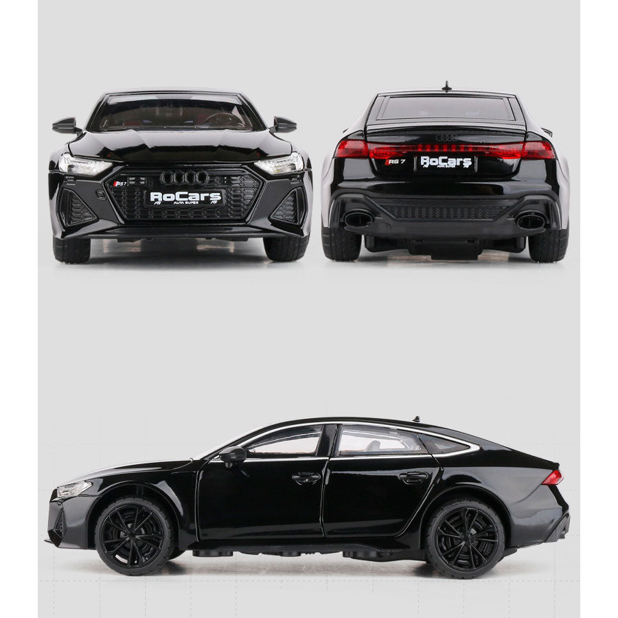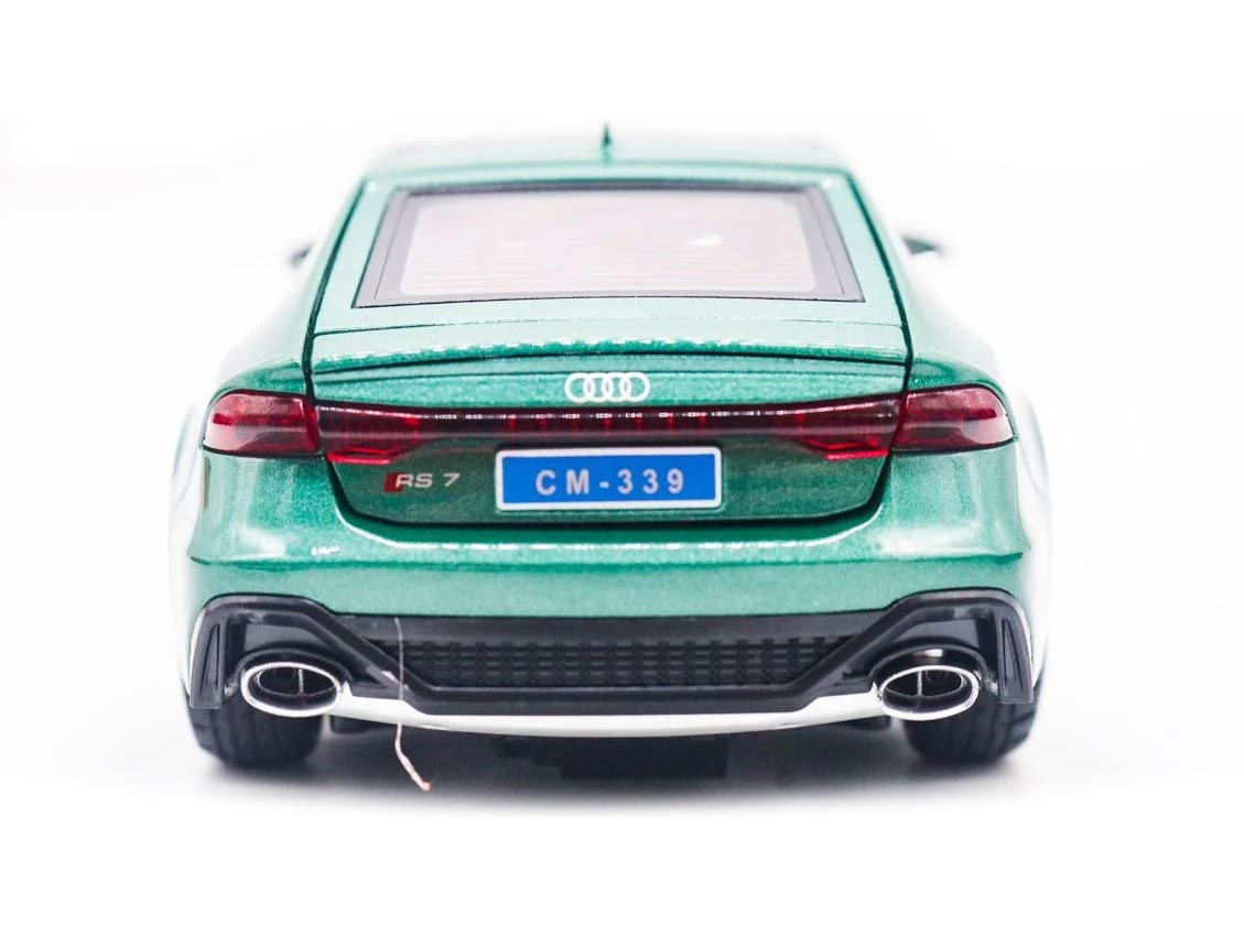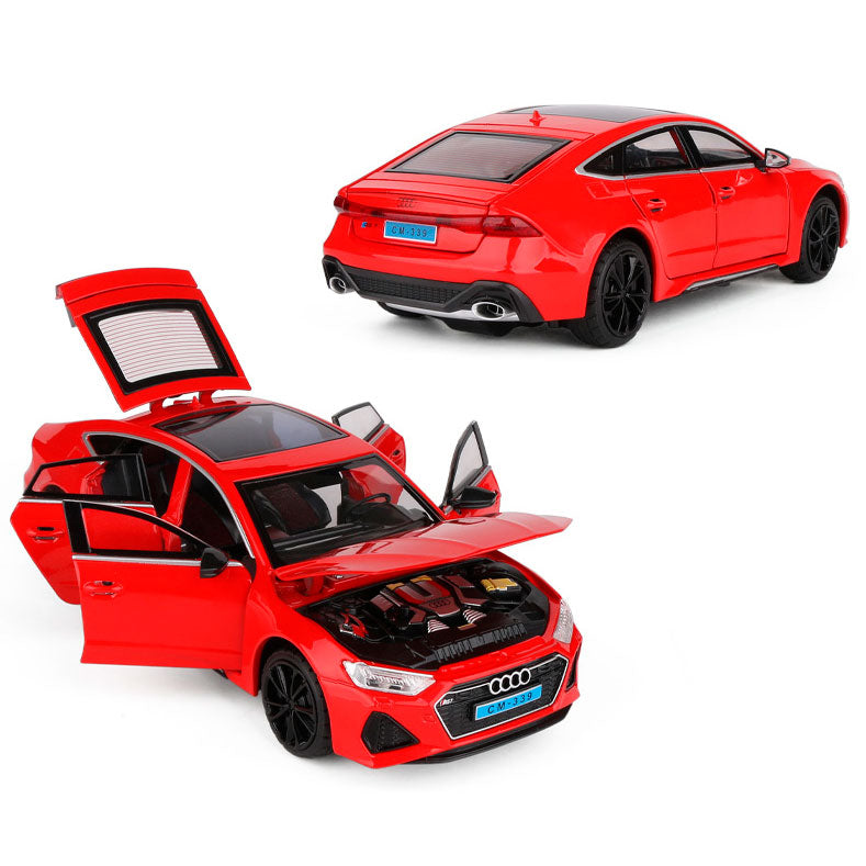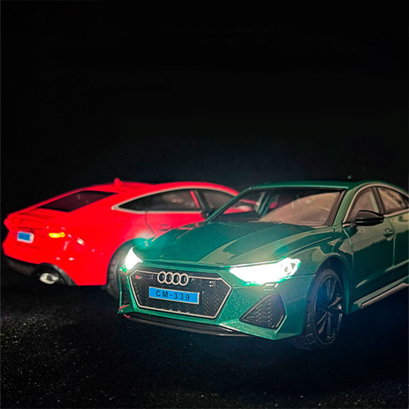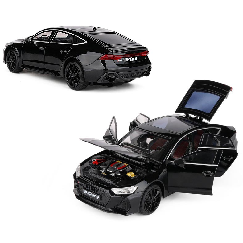 Miniatura de metal, em escala 1:24, de um Audi RS7 Coupé. Abre portas, capô e porta-malas. Os detalhes do motor e do painel, bancos e volante são muito realistas. Também gira o volante esterçando as rodas dianteiras, tem bancos dianteiros reclináveis e retrovisores móveis!