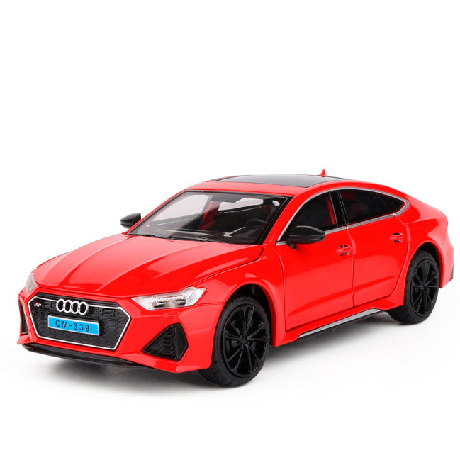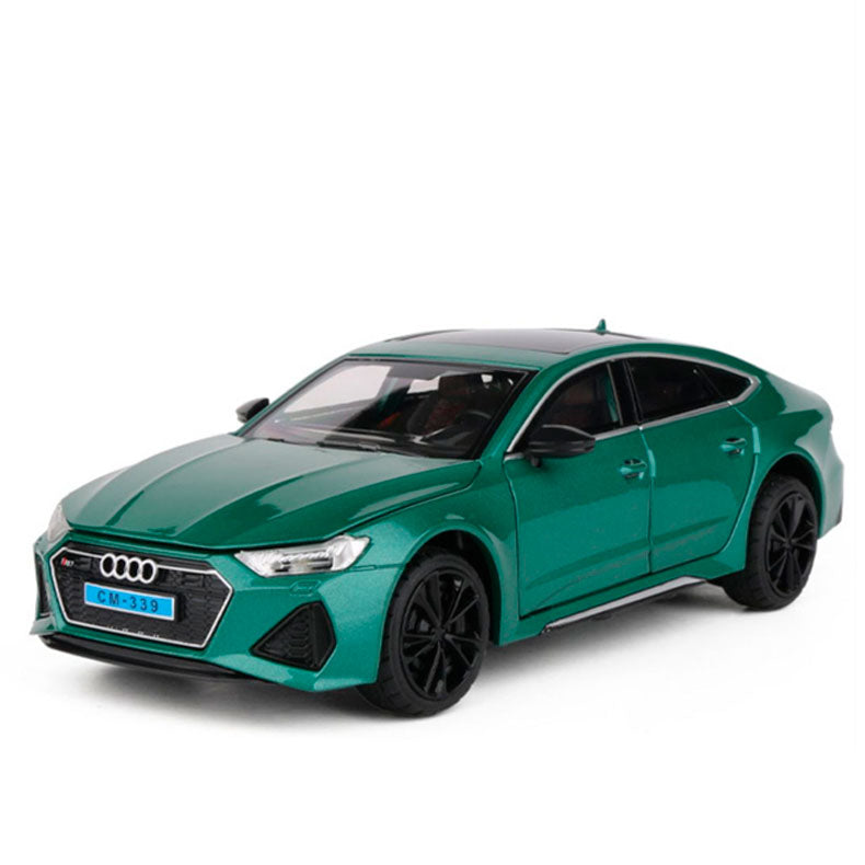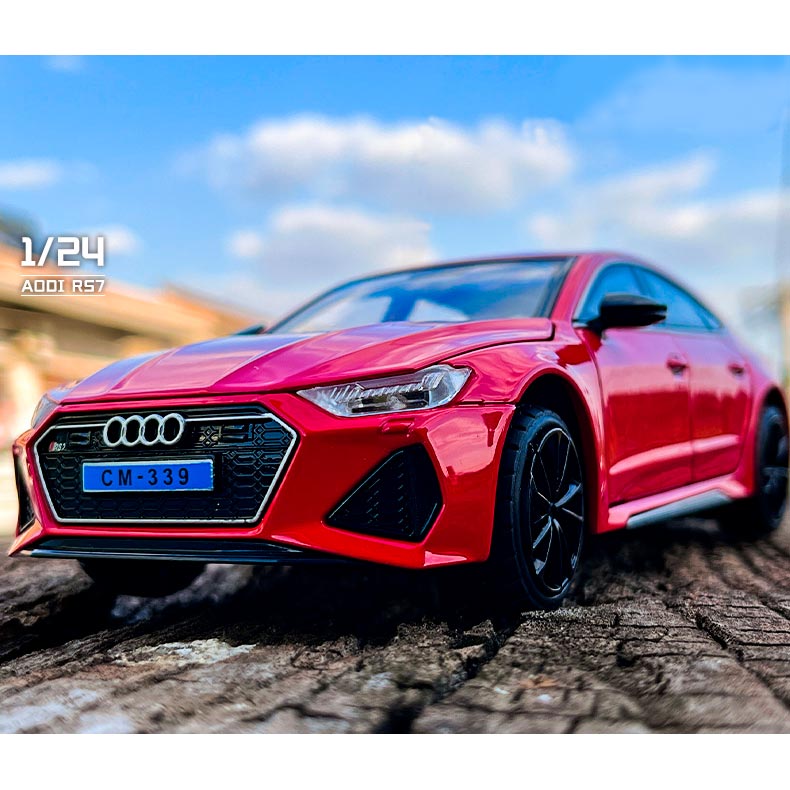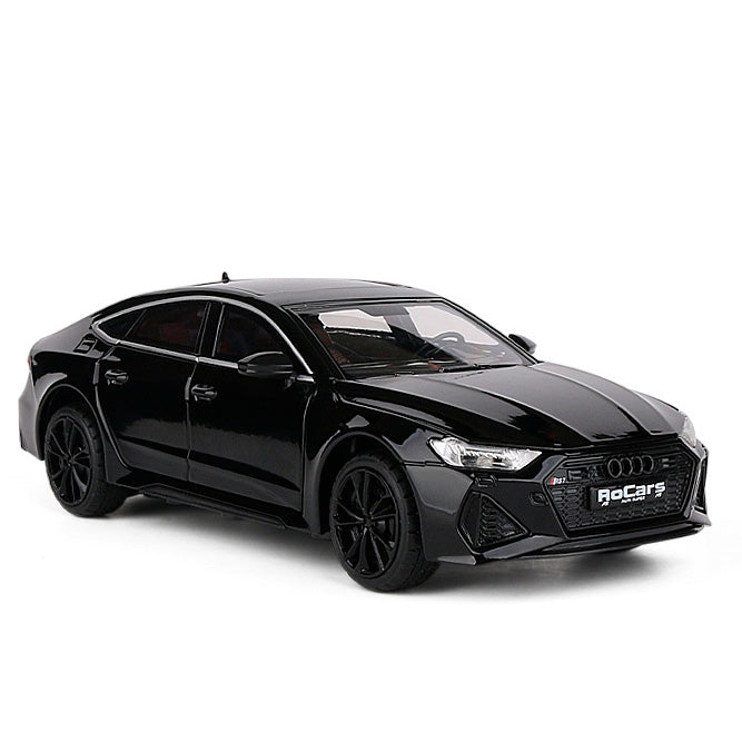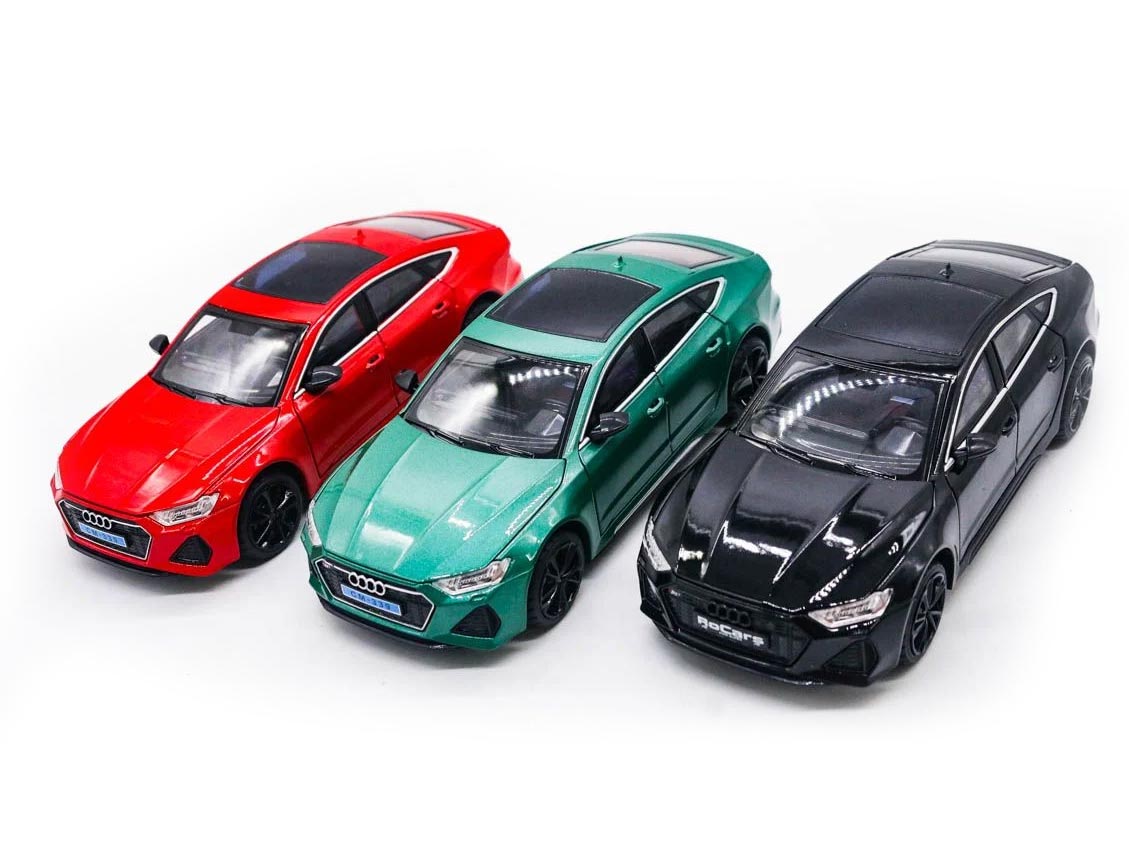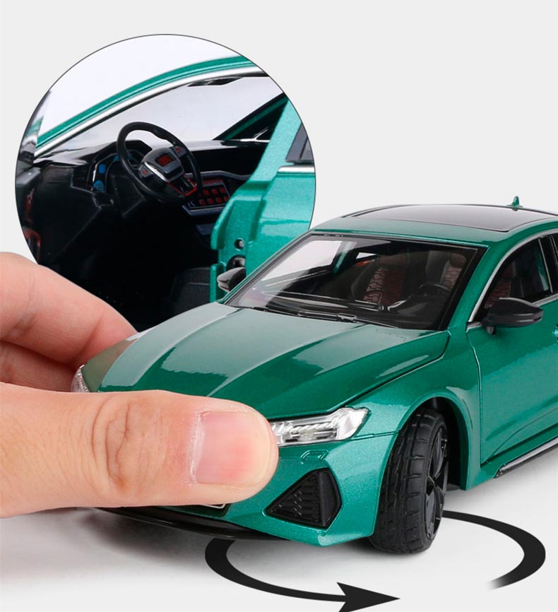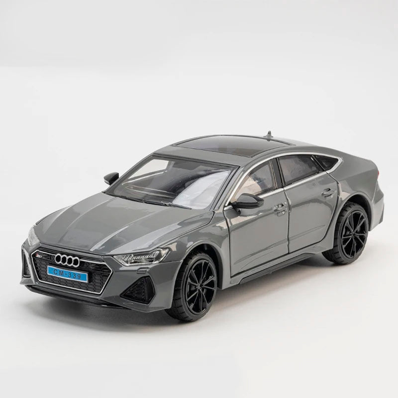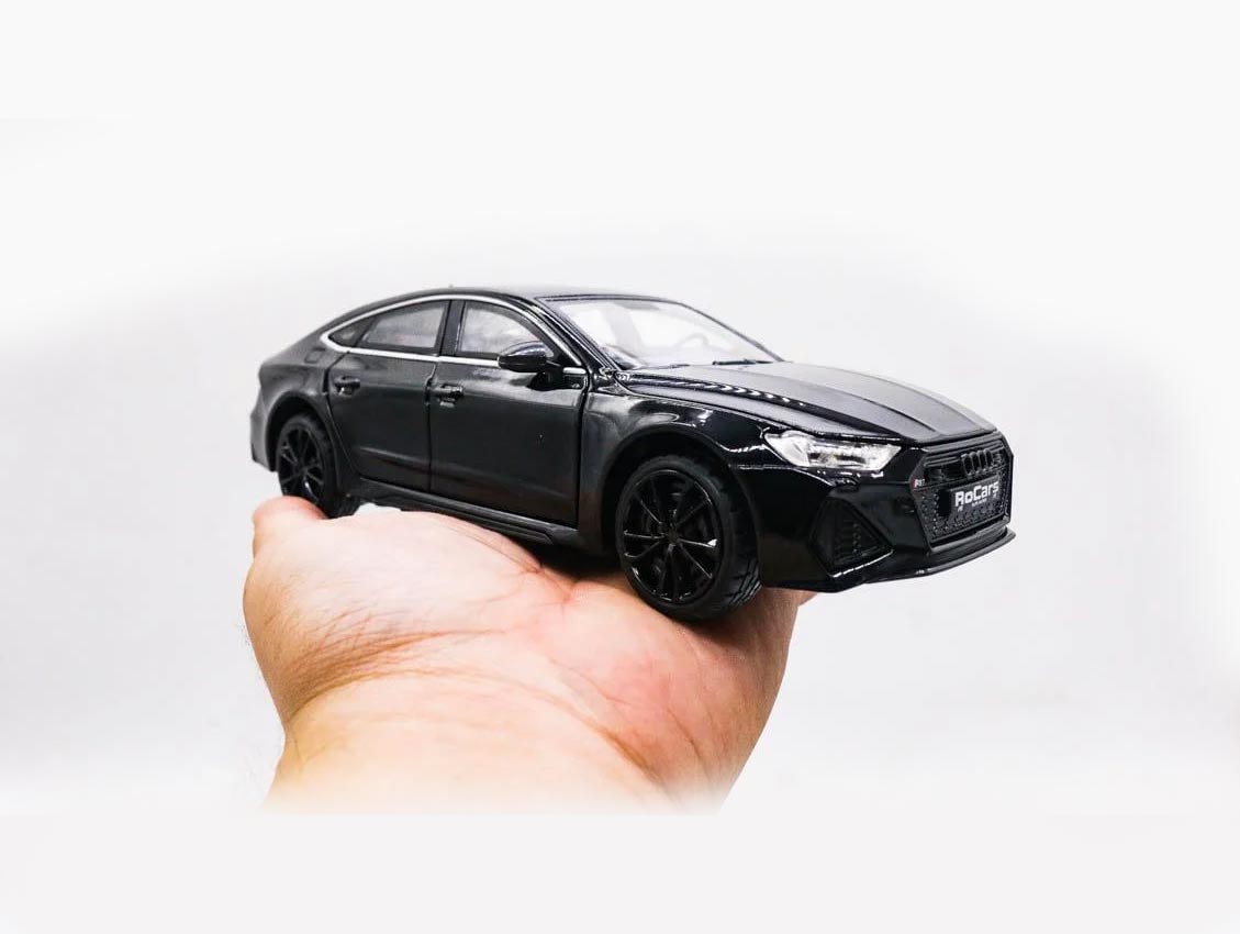 Miniatura de metal, em escala 1:24, de um Audi RS7 Coupé. Abre portas, capô e porta-malas. Os detalhes do motor e do painel, bancos e volante são muito realistas. Também gira o volante esterçando as rodas dianteiras, tem bancos dianteiros reclináveis e retrovisores móveis!