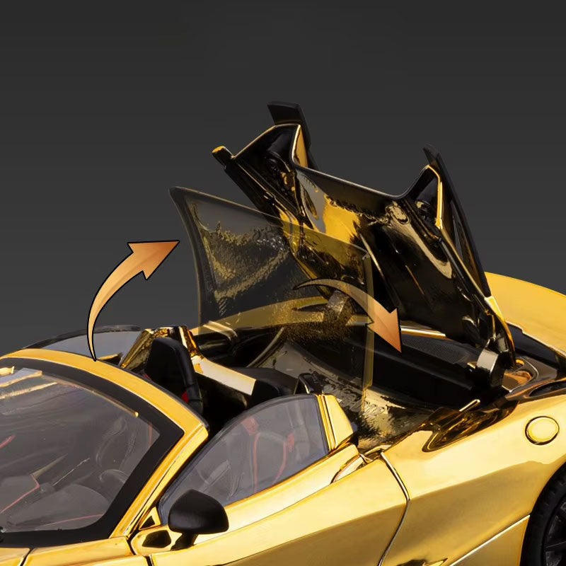 Cada detalhe deste supercarro foi reproduzido com perfeição – da carroceria aerodinâmica ao interior detalhado. A pintura metálica reflete a luz em diferentes ângulos, realçando curvas e contornos. A experiência fica completa com capota conversível, portas que abrem, rodas dianteiras esterçáveis e faróis dianteiros e traseiros com iluminação funcional.